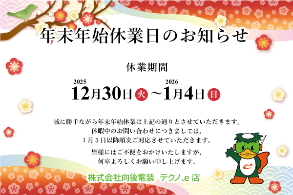 誠に勝手ながら下記の期間を年末年始休業とさせていただきます。 期間中のお問い合わせは1/5より順次対応いたします。